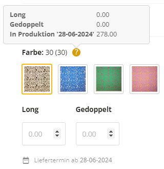 Sobald der Stoff bei uns eingetroffen ist, wird dieser so schnell wie möglich verarbeitet und an Sie ausgeliefert. Sie können bei "lang gerollt" oder "gedoppelt" die gewünschte Anzahl Meters eingeben (lang gerollt: ab 50 m / Stoffballen: ab 8 Meter)