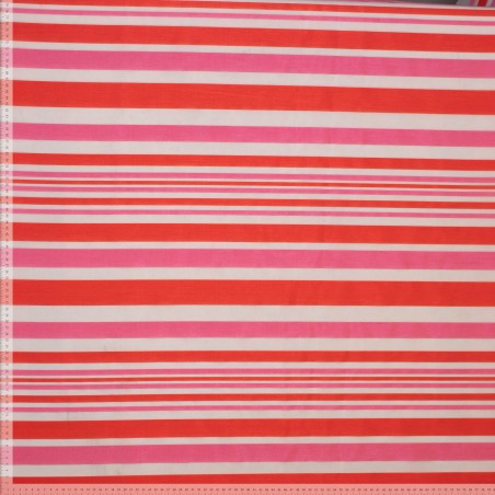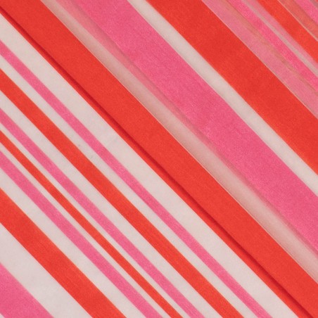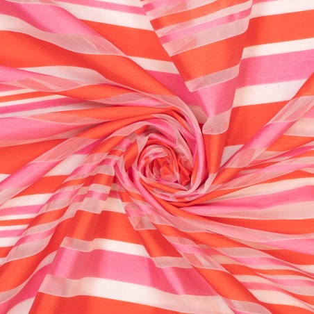 This woven fabric with sheer stripes has a unique combination of 60% polyester, 40% polyamide, and is sustainably produced according to OEKO-TEX Standard 100. This extremely lightweight fabric weighs 50 g/m2 and is 145 cm wide. Available in multiple colors.