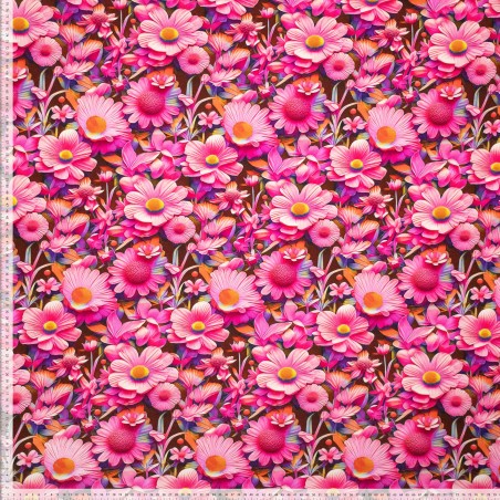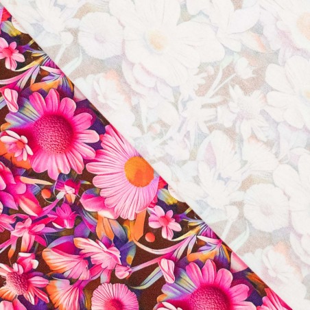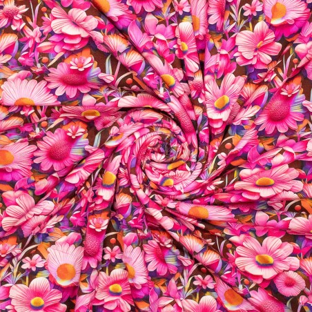 This knitted jersey fabric "Sarah 3D Flowers" with a floral motif is made of 97% viscose and 3% elastane, providing a soft, drapey texture with a slight stretch. The 3D floral print adds a vibrant and elegant appearance, making it ideal for refined and comfortable garments. With a width of 150 cm and a weight of 200 gr/m2, this fabric is perfect for T-shirts and fitted tops. The viscose offers breathability and luxurious comfort, while the elastane provides flexibility and a close fit. Certified by OEKO-tex Standard 100, this fabric is safe for the skin and free from harmful substances.