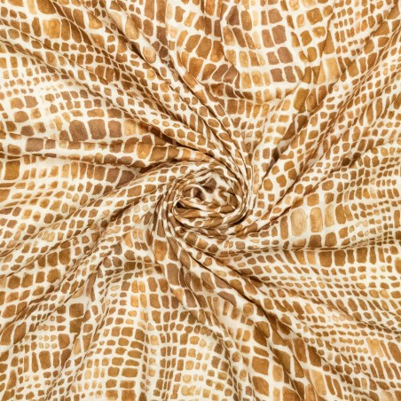This woven viscose fabric with a snakeskin print offers a modern and sophisticated look. The fabric drapes elegantly and moves fluidly, making it perfect for stylish dresses, blouses, and skirts. With a width of 160 cm and a weight of 105 g/m², this fabric is ideal for lightweight and airy designs. Certified according to OEKO-TEX Standard 100, ensuring it is safe for the skin and free from harmful substances.