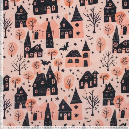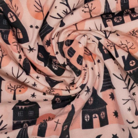 This knitted jersey fabric with a playful Halloween design combines comfort and stretch for an optimal fit. Thanks to its cotton and elastane composition, the fabric feels soft, moves smoothly, and retains its shape well. With a width of 150 cm and a weight of 200 g/m², this fabric is perfect for T-shirts, pajamas, leggings, and other comfortable garments. Certified according to OEKO-TEX Standard 100, ensuring it is safe for the skin and free from harmful substances.