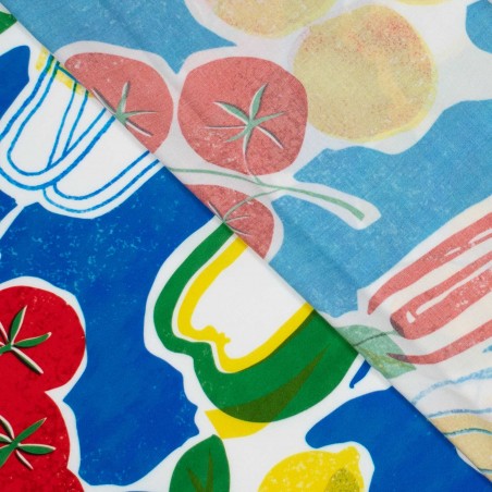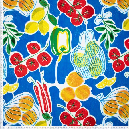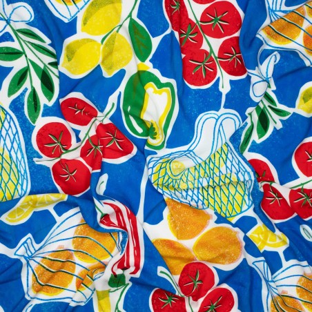 This playful viscose fabric is a tribute to vibrant summer markets! Tomatoes, oranges, lemons, and chili peppers are scattered across the surface, bringing a fresh Mediterranean vibe. The fruity print radiates joy and color – ideal for sunny creations with a cheerful touch.